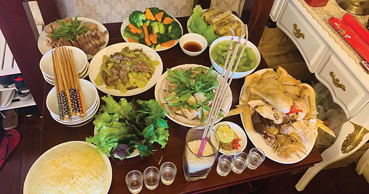 Gia chủ có thể làm mâm cỗ chay gồm: Giò, chả chay, nem chay hoặc nem nấm, canh nấm hoặc rau củ quả, đậu hũ...